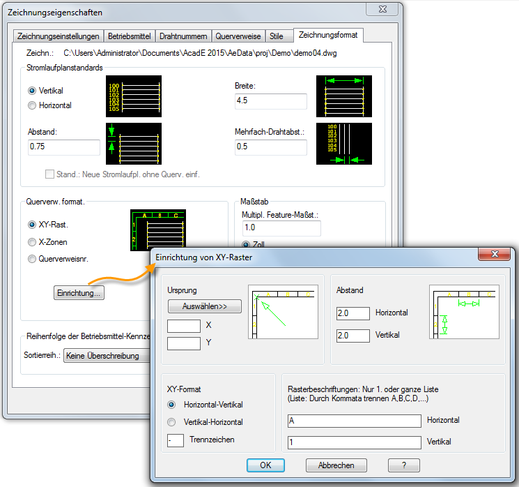 Für jede Stromlaufplanzeichnung kann ein Referenzsystem definiert sein: Stromlaufpläne, XY-Raster oder X-Zonen. Durch dieses Referenzsystem werden eindeutige Stromlaufplan-Betriebsmittel-Kennzeichnungen und eindeutige Drahtnummern zugewiesen (sofern keine fortlaufenden Kennzeichnungen verwendet werden). Das Referenzsystem wird auch für Querverweise verwendet, auf die wir später eingehen werden.