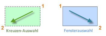 In einigen Fällen müssen Sie eine große Anzahl von Objekten auswählen. Anstatt jedes Objekt einzeln auszuwählen, können Sie die Objekte in einem Bereich auswählen, indem Sie auf eine leere Position klicken (1), den Cursor nach rechts oder links bewegen und dann ein zweites Mal klicken (2).