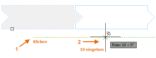 Als Nächstes verschieben Sie den Cursor nach rechts, halten sich dabei an den Winkel für die Spurverfolgung, um die horizontale Richtung beizubehalten, und geben dann 10 für den Abstand ein. Drücken Sie die EINGABETASTE oder die LEERTASTE ein zweites Mal, um den Befehl abzuschließen.