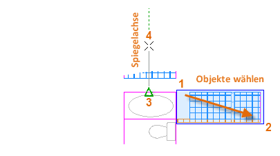 Im folgenden Beispiel wird der Befehl SPIEGELN (oder geben Sie in die Befehlszeile SP ein) mit einer Fensterauswahl (1 und 2) gestartet, um die Geometrie an der rechten Wand zu wählen. Drücken Sie die EINGABETASTE oder die LEERTASTE, und geben Sie dann eine Spiegelachse (3 und 4) an, die der Mittellinie des Badezimmers entspricht.
