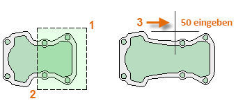 Verwenden Sie den Befehl STRECKEN (oder geben Sie in der Befehlszeile STR ein), und wählen Sie die Objekte durch eine Kreuzen-Auswahl aus, wie in der Abbildung unten gezeigt (1 und 2). Die Kreuzen-Auswahl ist obligatorisch. Es wird nur die Geometrie gedehnt, die von der Kreuzen-Auswahl gekreuzt wird. Klicken Sie dann auf eine beliebige Stelle im Zeichenbereich (3), bewegen Sie den Cursor nach rechts, und geben Sie 50 als Abstand ein. Dieser Abstand kann Millimeter oder Fuß darstellen.