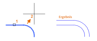 Wählen Sie das Objekt (1) aus, geben Sie den Abstand für den Versatz ein, und klicken Sie auf die Seite des ursprünglichen Objekts, an der das Ergebnis angezeigt werden soll (2). Beispiel für das Versetzen einer Polylinie.