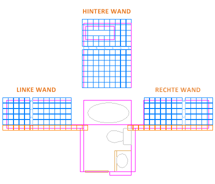 Die folgende Abbildung stammt aus einem Kachelprojekt. Die Wände in diesem Badezimmer eines Wohngebäudes sind abgeflacht, damit das Kachelmuster angeordnet und die Anzahl der benötigten Kacheln ermittelt werden kann.