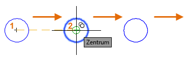 Verwenden Sie dann den Objektfangmodus Zentrum, klicken Sie auf den Mittelpunkt von Kreis 1, dann auf den Mittelpunkt von Kreis 2 usw.