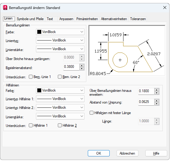 Der Vorgabebemaßungsstil heißt entweder Standard (Britisch) oder ISO-25 (Metrisch). Er wird allen Bemaßungen zugewiesen, bis Sie einen anderen Stil als aktuellen Bemaßungsstil festlegen.