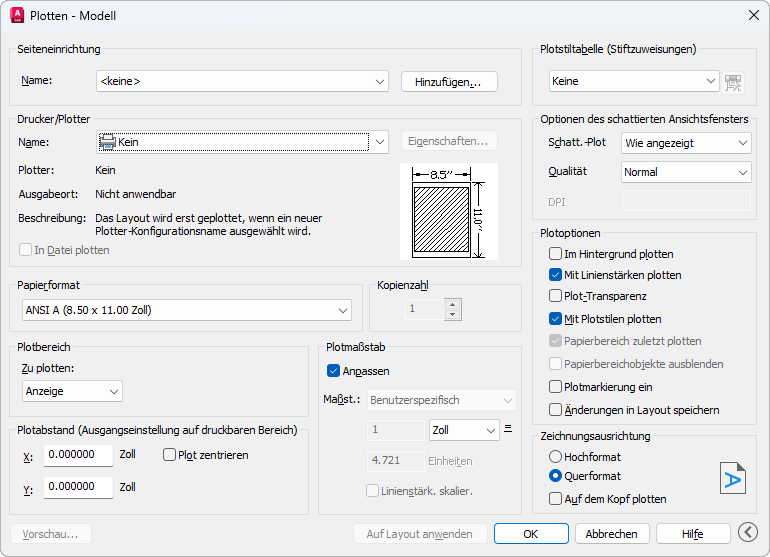 Jeder Layout-Registerkarte in der Zeichnung kann eine Seiteneinrichtung zugeordnet werden. Dies ist hilfreich, wenn Sie mehrere Ausgabegeräte oder -formate verwenden, oder wenn Sie über mehrere Layouts mit verschiedenen Größen in derselben Zeichnung verfügen.