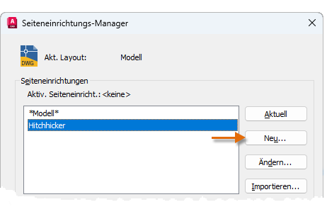 Um den Seiteneinrichtungs-Manager zu öffnen, klicken Sie mit der rechten Maustaste auf die Registerkarte Modell oder eine Layout-Registerkarte und wählen Seiteneinrichtungs-Manager aus. Der Befehl lautet SEITENEINR.