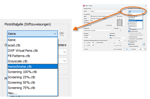 Die Plotstiltabelle enthält Informationen zur Verarbeitung von Farben. Farben, die zwar auf dem Monitor optimal angezeigt werden, sind möglicherweise nicht für PDF-Dateien oder zum Drucken geeignet. Möglicherweise möchten Sie eine farbige Zeichnung, jedoch eine monochrome Ausgabe erstellen. So legen Sie eine monochrome Ausgabe fest: