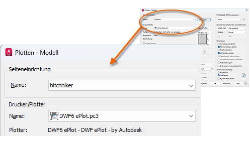 Um Ihnen die Arbeit zu erleichtern, können Sie Sammlungen dieser Einstellungen speichern und unter Verwendung der entsprechenden Namen wiederherstellen. Diese Sammlungen werden als Seiteneinrichtungen bezeichnet. Mit Seiteneinrichtungen können Sie die Einstellungen speichern, die Sie für verschiedene Drucker, das Drucken in Graustufen, das Erstellen von PDF-Dateien aus Zeichnungen usw. benötigen.