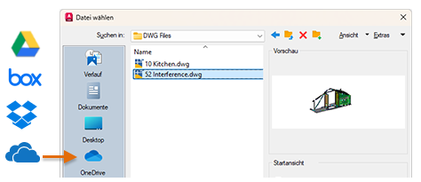 Wenn Sie über ein Konto bei einem Cloud-Speicheranbieter verfügen, können Sie es der Leiste Speicherorte in den AutoCAD-Dialogfeldern zur Dateiauswahl hinzufügen, um direkt zu den Zeichnungen in Ihrem Cloud-Speicherkonto zu navigieren. Klicken Sie einfach mit der rechten Maustaste in die Leiste der Speicherorte, und geben Sie einen Namen und Pfad für die Navigationsverknüpfung ein.