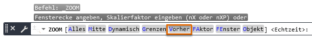 Sie können durch eine Reihe von vorherigen Ansichten zurückgehen, indem Sie im Befehlsfenster ZOOM eingeben und dann die Option Vorher wählen.