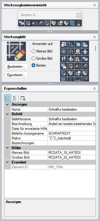 Mit dem CUI-Editor können Sie viele Elemente der Benutzeroberfläche ändern, die zum Starten eines Befehls im Programm verwendet werden.
