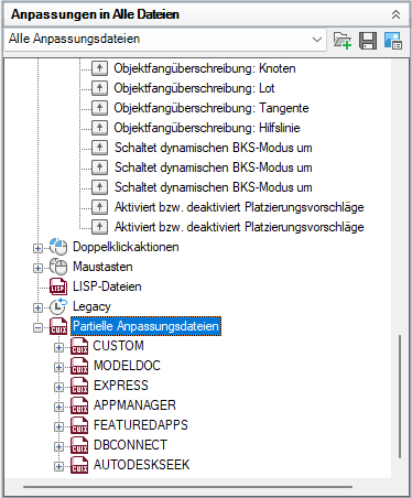Der Bereich Anpassungen in dient zur Navigation durch die verschiedenen Benutzeroberflächenelemente, die in den geladenen Anpassungsdateien enthalten sind.