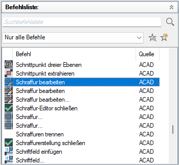 Oben im Bereich Befehlsliste befindet sich das Feld Suchbefehlsliste, mit dem Sie die Befehlsliste basierend auf einer eingegebenen Textzeichenfolge filtern können. Die Textzeichenfolge wird mit allen Teilen eines Befehlsnamens abgeglichen, woraufhin im Feld Befehlsliste die Ergebnisse angezeigt werden.