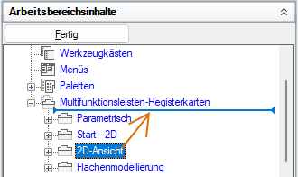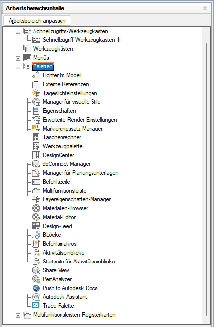 1. Klicken Sie auf der Registerkarte Anpassen im Bereich Anpassungen in <Dateiname> auf das Pluszeichen (+) neben dem Knoten Arbeitsbereiche, um ihn zu erweitern.