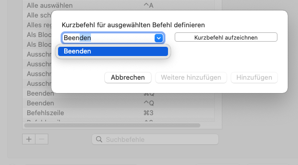 , um ein Tastaturkürzel hinzuzufügen.