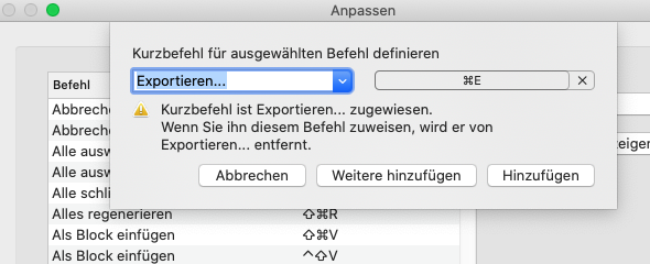 Anmerkung: Wenn die Tastaturkürzel bereits einem anderen Befehl zugewiesen sind, wird eine Meldung angezeigt, die angibt, für welchen Befehl die Tastaturkürzel verwendet werden.
