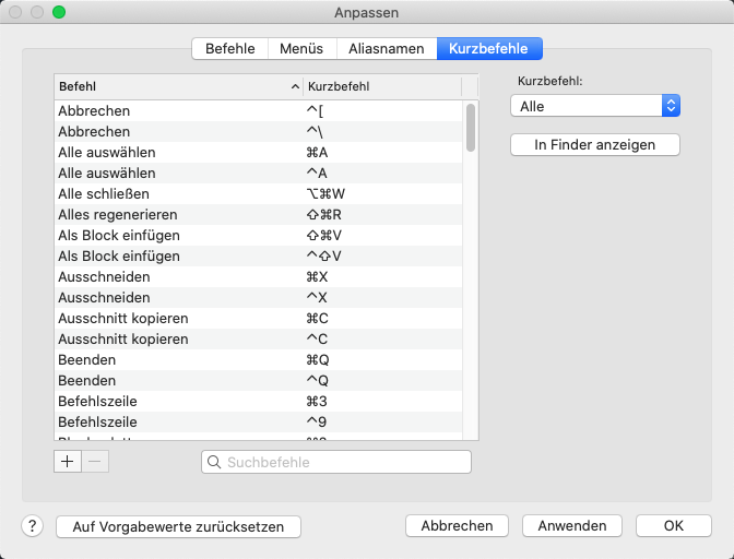 Anmerkung: Klicken Sie auf Auf Vorgabewerte zurücksetzen, um alle benutzerdefinierten Tastaturkürzel zu entfernen.