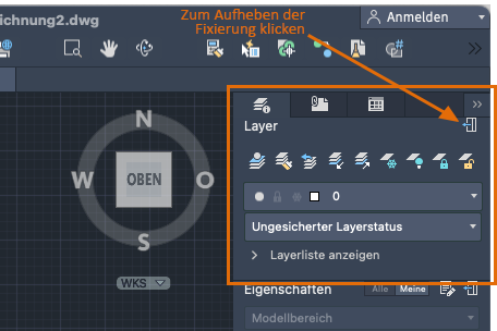 Um zu sehen, wie eine Zeichnung organisiert ist, verwenden Sie die Layer-Palette. Die Layer-Palette ist vorgabemäßig auf der rechten Seite über der Eigenschaftsprüfung fixiert. Heben Sie die Fixierung der Palette auf, um die Größe der Palette und der einzelnen Spalten in der Palette zu ändern.