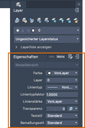 Sie können Eigenschaften wie Farbe und Linientyp einzelnen Objekten oder als den Layern zugewiesene Vorgabeeigenschaften zuweisen.