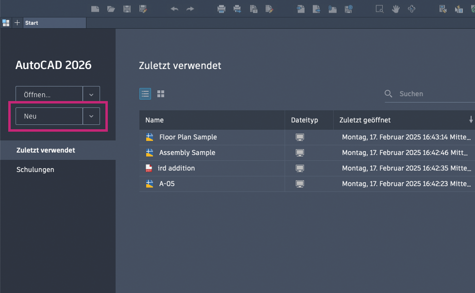 Klicken Sie nach dem Start von AutoCAD auf der Registerkarte Start auf Neu, oder klicken Sie auf die Dropdown-Liste Neu, um eine neue Zeichnung zu beginnen.