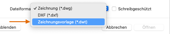 Sie können eine beliebige Zeichnungsdatei (.dwg) als Zeichnungsvorlagendatei (.dwt) speichern. Um eine Zeichnungsvorlagendatei auf Basis einer vorhandenen zu erstellen, öffnen Sie die vorhandene Zeichnungsvorlagendatei und ändern und speichern sie unter einem anderen Namen.