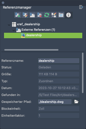 Die Referenzmanager-Palette enthält einen Werkzeugkasten am oberen Rand. Sie können mit der rechten Maustaste auf die Dateiliste klicken, um ein Kontextmenü anzuzeigen, mit dem Sie eine angehängte externe Referenz anhängen oder verwalten können. Klicken Sie auf die Schaltfläche Details anzeigen in der Symbolleiste, um Details und Miniaturansichten der ausgewählten externen Referenz anzuzeigen.