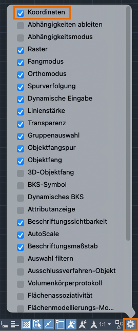 Wenn in der Statusleiste keine Koordinaten angezeigt werden, wählen Sie in den Statusleisteneinstellungen die Option Koordinaten aus.