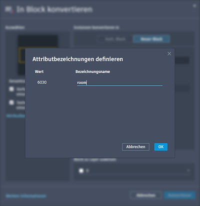 Neben dem Konvertieren übereinstimmender Instanzen in einen Block können Sie anschließend auch Attributbezeichnungen für Textvariationen angeben, indem Sie auf Attributbezeichnungen definieren klicken.