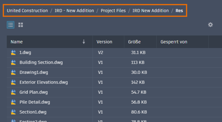- Oberhalb der Zeichnungsliste des Projekts werden Navigations-Breadcrumbs für den aktuellen Projektpfad angezeigt.
