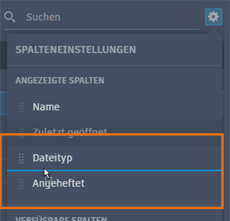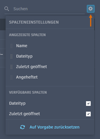 - In der Listenansicht können Sie die Spaltenüberschriften durch Klicken auf Einstellungen anpassen. Name und Fixiert sind dauerhaft angezeigte Spalten.