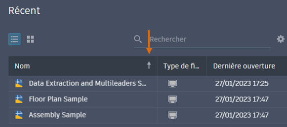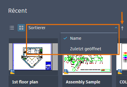 Die Liste der zuletzt verwendeten Zeichnungen enthält kleinere Miniaturansichten, damit mehr Zeichnungen angezeigt werden können. Sie können jetzt die zuletzt verwendeten Zeichnungen sowohl in der Raster- als auch in der Listenansicht sortieren und durchsuchen.