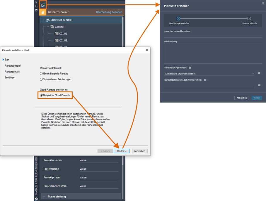 In dieser Version bietet der Manager für Planungsunterlagen für Webversionen einen einfachen Zugriff zum Erstellen eines Plansatzes in Autodesk Docs, unabhängig davon, ob Sie die AutoCAD-Desktop-App oder die AutoCAD-Web-App verwenden.