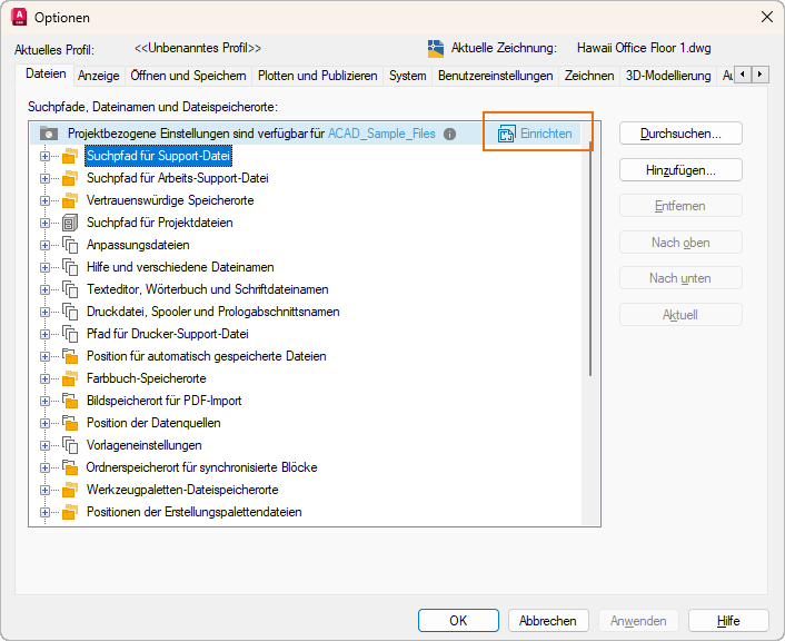 Zeigen Sie das Dialogfeld Optionen an, und klicken Sie auf die Registerkarte Dateien > Einrichten, um projektbezogene Support-Dateien einzurichten.