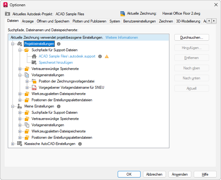Beim Einrichten von Support-Dateien für ein Autodesk Docs-Projekt erstellt AutoCAD einen Ordner mit dem Namen .autodesk.support. AutoCAD durchsucht .autodesk.support (und seine Unterordner) als Ausgangspunkt innerhalb des Autodesk Docs-Projekts nach erforderlichen Support-Dateien. Dies kann durch Hinzufügen weiterer Speicherorte von Support-Dateien über mehrere Projekte hinweg noch erweitert werden. Bei Bedarf können auch personalisierte Speicherorte und Einstellungen hinzugefügt werden.