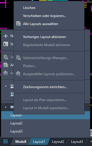 Klicken Sie mit der rechten Maustaste auf einen Layoutnamen, um weitere Optionen anzuzeigen.