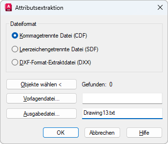 Legt das Dateiformat für die Attributinformationen fest, bestimmt die Objekte, aus denen die Informationen extrahiert werden sollen, und gibt den Namen der Schablone und der Ausgabedatei für die Daten an.