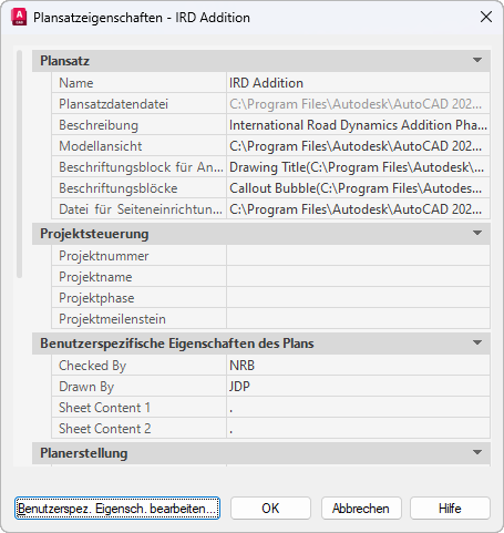 Zu diesen Informationen gehören Pfad und Dateiname der DST-Datei (Plansatzdaten), die Pfade zu den Ordnern, in denen die Zeichnungsdateien der Plansätze abgelegt sind und alle mit dem Plansatz verbundenen benutzerspezifischen Eigenschaften