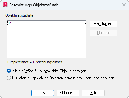 Fügt unterstützte Maßstäbe für das ausgewählte Beschriftungsobjekt hinzu oder löscht sie.