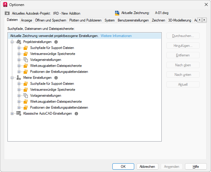 - Erweitern Sie auf der Registerkarte Autodesk-Projekte das Projekt, für das Sie verbundene Support-Dateien einrichten möchten.