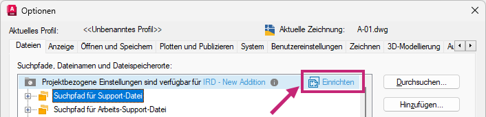 Anmerkung: Wenn die Option Einrichten nicht angezeigt wird, wurde das Projekt möglicherweise bereits konfiguriert. Dies kann anhand der Anzeige des Texts "Aktuelle Zeichnung verwendet projektbezogene Einstellungen" überprüft werden.