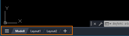 Anmerkung: Sie können zwischen verschiedenen Layouts und der Registerkarte Modell wechseln, indem Sie auf eine Registerkarte unten im Zeichenbereich klicken. Die Registerkarten Layout und Modell werden nur angezeigt, wenn Sie auf der Registerkarte Anzeige (Dialogfeld Optionen) die Option Registerkarten Layout und Modell anzeigen ausgewählt haben.