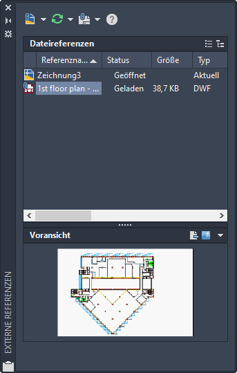 Sie können dateispezifische Informationen über die Unterlagen, die einer Zeichnung zugeordnet sind, in der Palette Externe Referenzen anzeigen. Sie können Unterlagen auch laden und entfernen sowie andere Vorgänge ausführen.