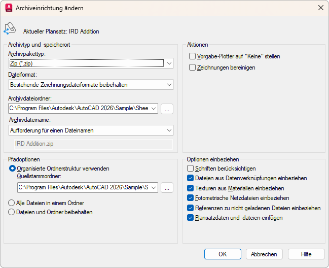 Ändert die Pfade, die Vorgabeformate, die Organisation und andere Einstellungen für einen archivierten Plansatz.