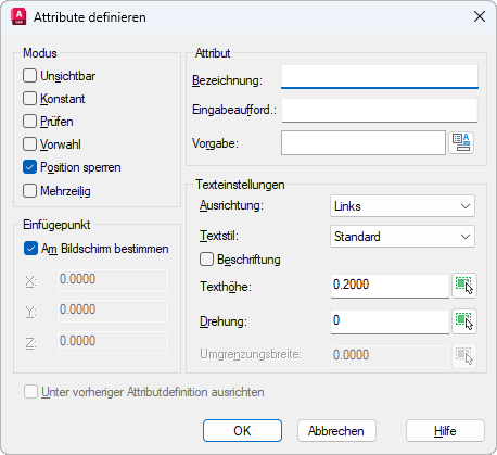 Die Vorgabewerte werden in der Systemvariable AFLAGS gespeichert. Eine Änderung der Einstellungen für AFLAGS wirkt sich auf den Vorgabemodus für neue Attributdefinitionen aus und nicht auf vorhandene Attributdefinitionen.