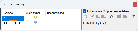 Ist eine Gruppe nicht wählbar, ist das Glühlampensymbol deaktiviert. Bei Auswahl eines einzelnen Gruppenelements wird dann nur dieses Objekt ausgewählt. Wenn die Systemvariable PICKSTYLE auf 0 gesetzt ist, können keine Gruppen ausgewählt werden.