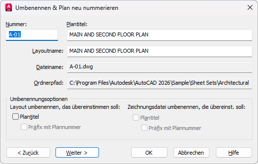 Lädt den nächsten Plan in dieses Dialogfeld. Diese ist eine einfache Möglichkeit, eine Reihe von Plänen neu zu nummerieren oder umzubenennen.