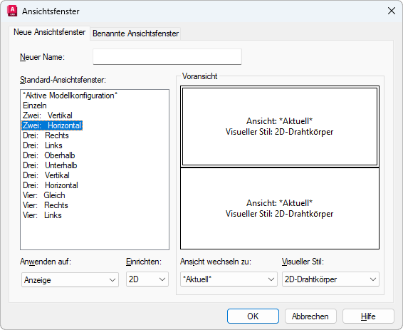 Bestimmt eine 2D- oder eine 3D-Einrichtung. Bei der Option 2D wird die neue Ansichtsfensterkonfiguration erstellt. Hierbei wird die aktuelle Ansicht in allen Ansichtsfenstern dargestellt. Bei der Option 3D wird ein Satz von orthogonalen Standard-3D-Ansichten auf die einzelnen Ansichtsfenster in der Konfiguration angewandt.