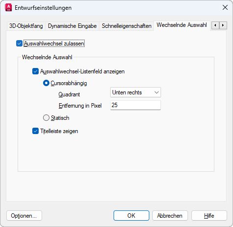 Steuert, ob die Funktion zum Wechseln der Auswahl aktiviert ist. (Systemvariable SELECTIONCYCLING)