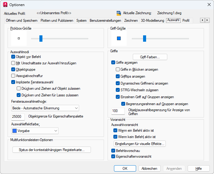 Zeigt die Auswahlvorschau an, wenn keine Befehle aktiv sind. (Systemvariable SELECTIONPREVIEW)